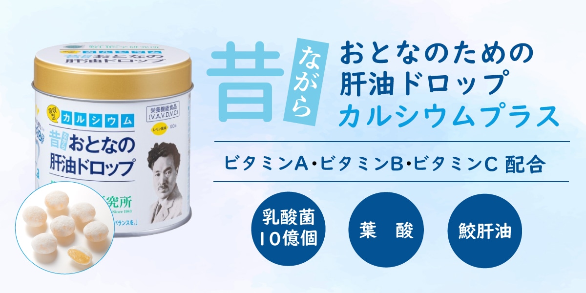 日本人に最も不足していると言われている栄養素「カルシウム」を配合し、レモン味に仕上げました。おとなの肝油ドロップ同様、ビタミンA・ビタミンD・ビタミンCはもちろん、葉酸や乳酸菌に加え、本物のサメ肝油エキスも配合しています。