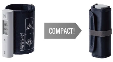 上腕式血圧計に関わらず、カフについたゴムバンドで本体をコンパクトにまとめられます。デスクの上に置いても、場所を取らず、仕事中や旅行先、朝昼晩など、あらゆる時間や場面でサッと取り出せて使える血圧計です。