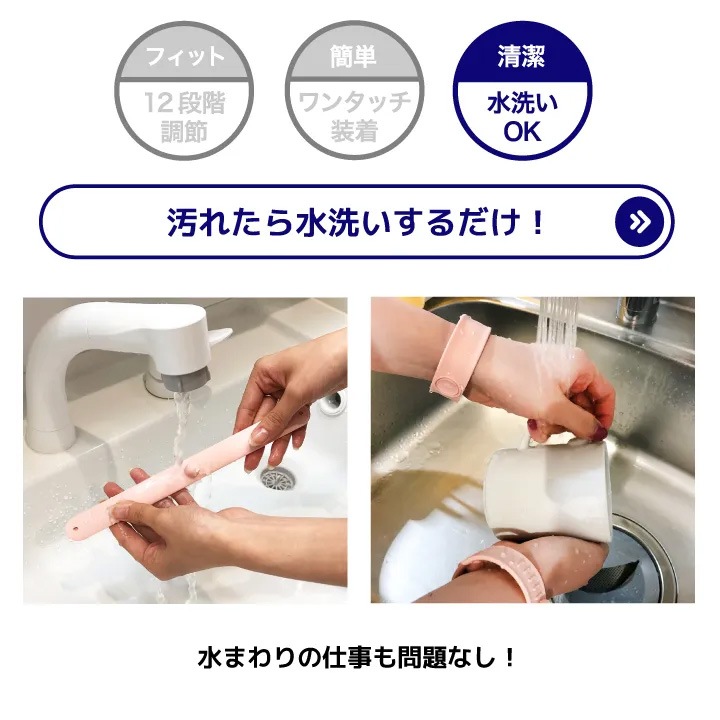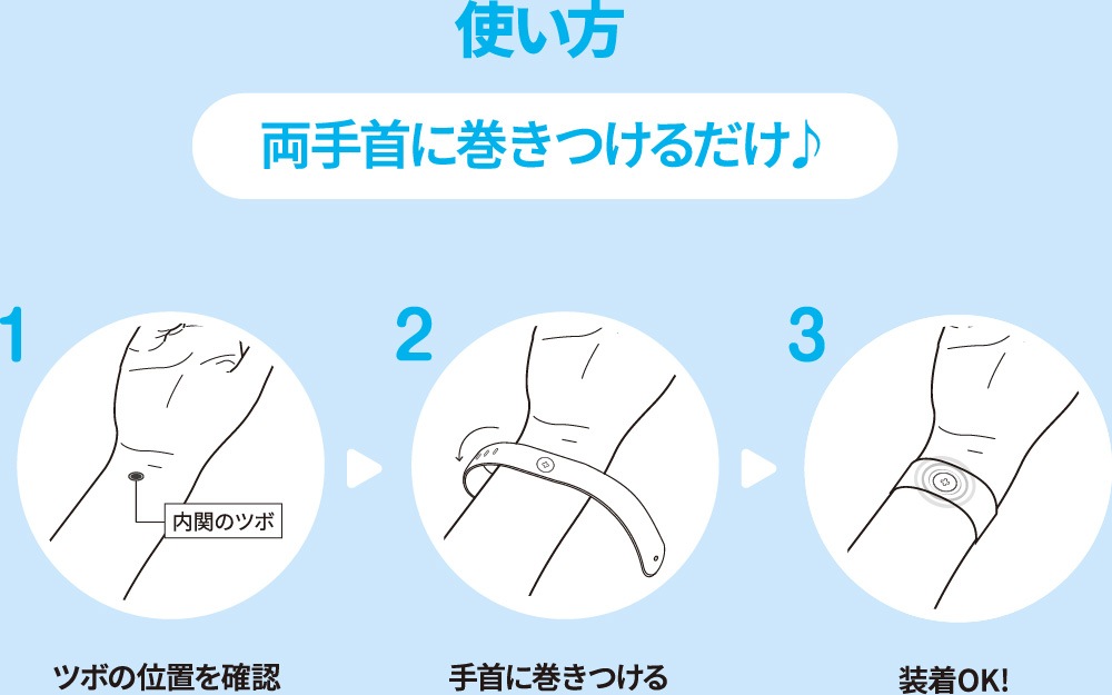 両手首にある「内関(ないかん)」のツボを刺激し、辛いつわりや乗り物酔い、気圧の変化による吐き気やムカつきを緩和。バンドを両手首に巻くだけの簡単装着です。シリコン製なので水濡れも安心。バンドの長さは12段階で調整できるのでお子様から大人までお使いいただけます。