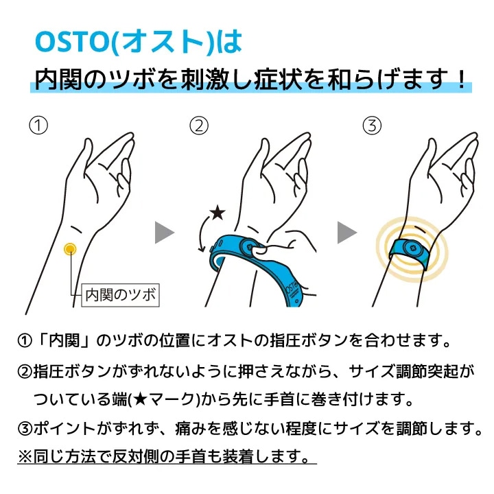 ・必ず説明書に従い、適切なポイントにセットしてご使用ください。それ以外の部位に装着することはしないでください。・オストは症状を治療するものではなく、ツボの刺激による症 状の対策や緩和を促すもので、その効果には個人差があります。